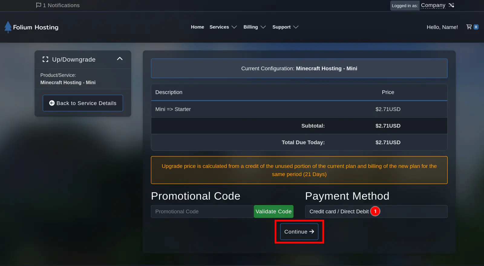 Confirm your payment method, and click “Continue”. After clicking this button an invoice will be generated.