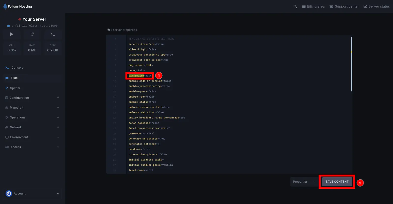 Scroll down until you find difficulty=[value]. Change [value] to your preferred difficulty (peaceful, easy, normal, or hard) and click Save Content.