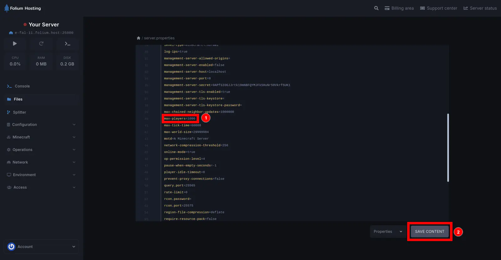 Scroll down until you find max-players=[value]. Change [value] to your preferred player count and click Save Content.