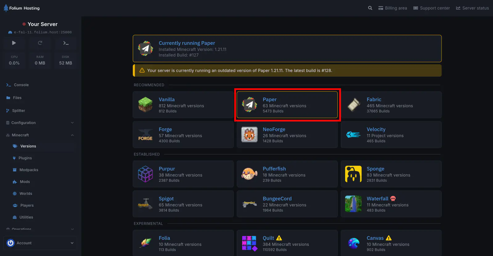 Under the Minecraft Section, Go to the Version tab and click on “Paper”