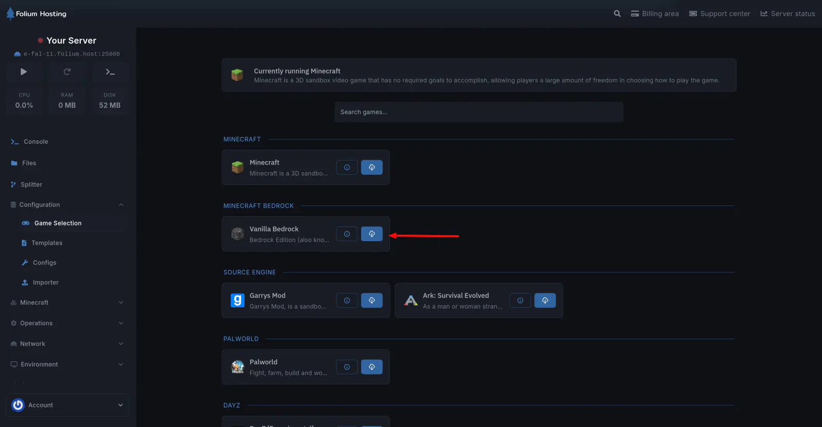 Game Selection lets you change what game your server runs. You can switch between any supported game without needing a new server.