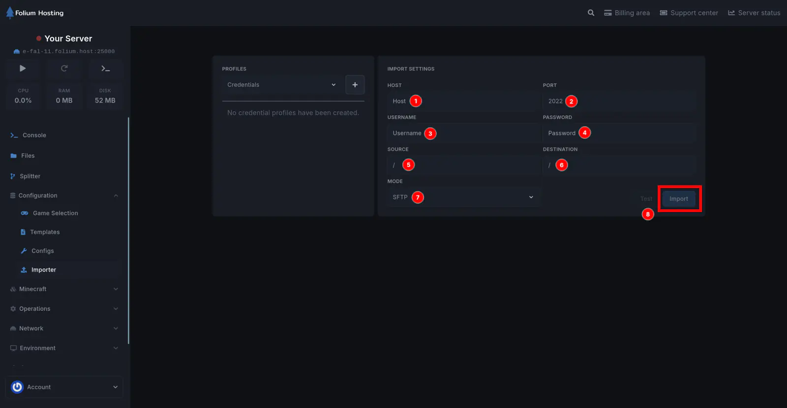 The Importer lets you migrate your server from any other hosting provider by connecting to their SFTP. This is great for transferring all your files without manually downloading and re-uploading them.